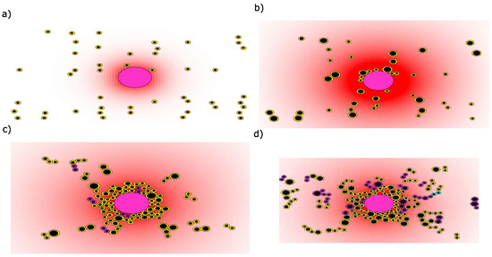 The sequential steps of myeloma cells homing to a BMSC. Myeloma cells are represented by the cells with the smaller radii and the BMSC is the large cell in the middle. Each clone of multiple myeloma (MM) cells is denoted by a specific color. The red color gradient represents the summed concentrations of the cytokines SDF-1, IL-6, and IGF-1 shown with white (0) to red (1). (a) After their infiltration, the myeloma cells move towards the BMSC; (b) The surviving cells surround the BMSC; (c) The myeloma cells divide and form the tumor niche; (d) The tumor expands and more aggressive subclones start emerging.