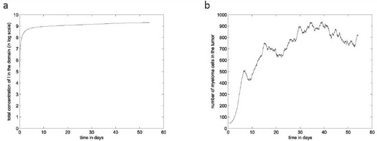 (a) The total concentration of the IL-6 and IGF-1 cytokines over time in log scale; (b) The total number of malignant cells over time.