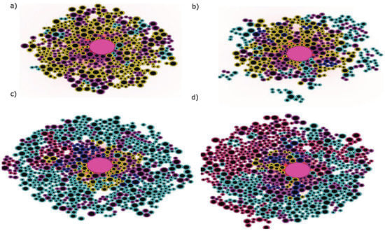 Snapshots of a simulation showing the competition between clones. (a) The tumor consists mainly of the clone (shown in yellow) with few cells in the intermediate state (in purple) between clones and the emergence of the clone (in cyan) in the sides. The size of the tumor remains limited because clone cells need relatively high concentration of I to survive; (b) Compared to the clone , the clone cells expand and survive in areas with lower concentration of cytokines; (c) The clone cells surround the tumor and crowd out the cells of the clone leading to the reduction of their population. The clones (in blue) and (in magneta); (d) The subclone is as aggressive as the subclone due to the additional IRF4 mutation and it manages to coexist with it in the remote areas with fewer cytokines.