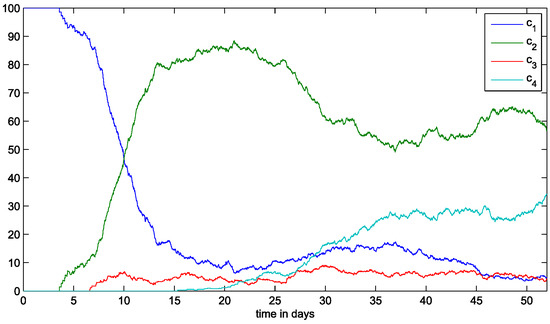 The emergence of more aggressive clones not only reduces the populations of the less aggressive ones but also increases the total number of malignant cells. These clones survive in areas farther from the BMSC, making the tumor expand. We show the total number of malignant cells over time in Figure 4b. The proportions of each clone in the total population show that in the end of the simulation, the clone only represents ≈5% of the total population. The subclone is predominant, with ≈60% of cells (Figure 6). Overall, the global population of malignant cells increases with the emergence of more resistant subclones. The emergence of the subclone leads to an increase in the number of malignant cells because the cells belonging to this subclone can survive far from the BMSCs. The subclone emerges few hours after but barely manage to survive because of limited resources. It gives rise to the subclone , which is as aggressive as the subclone due to the additional IRF4 mutation. As the tumor progresses, these two subclones and become predominant because they are better adapted to survive in sites with limited resources. By the end of the simulation, the number of malignant cells oscillates around a stable value as well as the total concentration of cytokines in the domain (Figure 4). We show the percent of the malignant cell population occupied by each clone over time in Figure 6.
