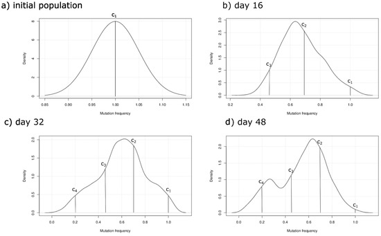 Gaussian kernel density plots indicating the frequency of cells acquiring each specific mutation at the different stages of the simuation. (a) The initial population composed of cells belonging to the subclone ; (b) is the most predominant subclone after 16 hours of the beginning of the simulation; (c) The K-RAS subclones and emerge and start expanding; (d) The clones and represent the majority of the population because they are equally aggressive.