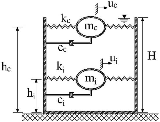 where, ρs and E are the mass density of liquid and modulus of elasticity of the tank’s wall, respectively. The coefficients Cc and Ci, the relative convective and impulsive masses (mc/m and mi/m) and heights (hc/H and hi/H) are provided by Malhotra et al. [9]. The total liquid mass of the tank filling with water is equal to (πr2Hρw). The corresponding stiffness and damping ratio of springs and dashpots associated with convective and impulsive masses are equal to: