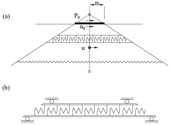 Based on the cone method theory, when a homogenous semi-infinite domain is subjected to a static load (P0), the components of the displacement field will vary along the depth in the shape of a truncated cone, as shown in Figure 4, for the horizontal translational degree of freedom. The static stiffness of this truncated cone in a circular rigid foundation and equivalent circular foundation can be expressed by [19]: