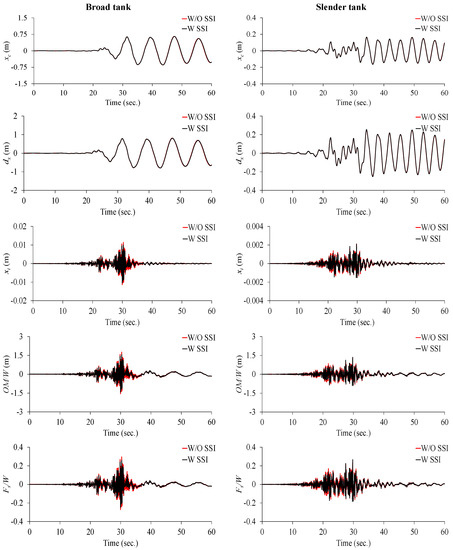 In this section, the effect of SSI on seismic responses of both broad and slender liquid storage tanks is studied. For example, Figure 6 depicts the time history of considered responses of two broad and slender tanks mounted on soil type 4 under Chichi-NST-E ground motion in both without SSI and with SSI, respectively.