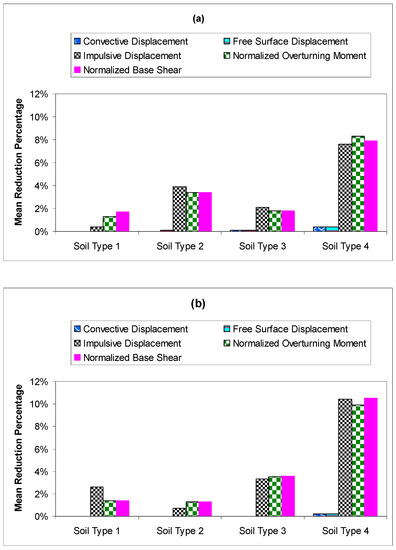 From Table 5, Table 6, Table 7, Table 8, Table 9, Table 10, Table 11 and Table 12, it is observed that the maximum values obtained for the reduction percentage of impulsive mass displacement, normalized overturning moment and normalized base shear are 13.2%, 20.3%, and 20.7% for broad tank under Chichi-NST-E ground motion, and 20%, 19.1%, and 22.5% for slender tank under Chichi-TCU075-W earthquake, when the liquid storage tank rested on soil type 4 (see Table 11 record no. 1 and Table 12 record no. 2). From all the data of Table 5, Table 6, Table 7, Table 8, Table 9, Table 10, Table 11 and Table 12 (for the six selected earthquake ground motions), Figure 7 shows the mean reduction percentages of peak responses in broad and slender tank due to SSI effect (where for the calculation of each mean reduction percentage, in those only very few specific cases in which there is amplification and not reduction because of the frequency content of the earthquake and the structure, those reduction percentages are taken as negative). Generally, as the shear velocity of medium soil decreases, the aforementioned responses reduce further. The mean reduction percentages of impulsive mass displacement, normalized overturning moment, and normalized base shear are 7.6%, 8.3%, and 7.9% for broad tank, and 10.4%, 9.9%, and 10.5% for slender tank, when the liquid storage tank rested on soil type 4. According to Figure 7, the convective mass displacement and also free vertical surface displacement is only slightly reduced. This is due to long period of convective mass. However, for soil type 4, the SSI causes to reduce the convective mass displacement and also free vertical surface displacement, compared to the without SSI condition. This phenomenon is observed in both broad and slender tanks.