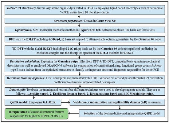 Arylamine organic dyes (AOD) with donor (D), π-bridge (π), and acceptor (A) moieties for DSSCs have received great attention in the last decade because of their high molar absorption coefficient, low cost, and structural variety. In the case of DSSCs, a large number of experimental works are available [], together with some theoretical studies []; joint experimental and theoretical [,,] work is becoming the common research strategy. However, the development and optimization of materials for organic solar cells is, in general, not yet rational, but rather empirical. The aim of the present work is to determine the macroscopic characteristics of arylamine organic dyes of DSSCs from computed molecular properties and to elucidate the elementary mechanistic steps of electron transfer in such solar cells through DFT and TD-DFT studies, followed by quantitative structure-property relationship (QSPR) study. The use of in silico methods for chemical property prediction is well established and the QSPR method emerged as an important computational tool with a diverse range of applications []. Robust and validated QSPR models can predict properties of new or untested molecular structures and provide insights that expedite the design of new compounds with enhanced desired properties []. When applied to the property and energy efficiency of compounds, regulatory agencies worldwide have already accepted the implications of QSPR models that can explore the central relationship between organic dyes and the composite system of DSSCs. This kind of study not only saves resources but also provides some guidance for the synthesis of more efficient dye sensitizers in the future.