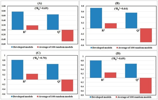 The robustness of the models was checked based on the Y-randomization technique. For a robust model, the determination coefficient (R2) of the non-random model should exceed the squared average correlation coefficient of the randomized models (Rr2). The model randomization was performed 100 times via shuffling the dependent variables while maintaining the original independent variables. The average R2 of 100 random models was computed and defined as Rr2 followed by calculation of the cRp2 parameter [,] that penalizes model R2 for small differences in the values of R2 and Rr2.