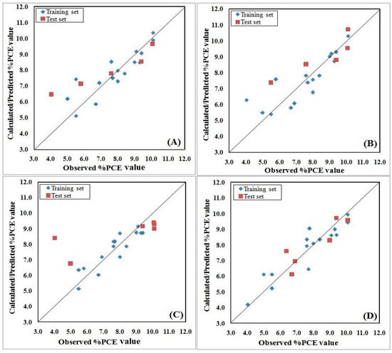 A limited number of QSPR models have been developed to model the power conversion efficiency (PCE) value of solar cells to date. Though few QSPR models were developed for the modeling of PCE of DSSCs, the only global QSPR model was reported by our group for Fullerene derivatives (FDs) as an acceptor for polymer-based solar cells (PSCs). We have revealed nine FDs with promising PCE values through QSPR models from virtual screening with a 200% increase in PCE value, compared to existing FDs as acceptors []. Venkatraman et al. [] reported the first successful application of comparative molecular field analysis (CoMFA) and vibrational frequency-based eigenvalue (EVA) descriptors to model molecular structure-photovoltaic performance relationships for a set of 40 coumarin derivatives as dyes for DSSCs. The obtained models provided statistically robust predictions of PCE values for all studied dyes. In another study, Venkatraman et al. [] investigated de novo computational design methodology to design a coumarin-based dye sensitizer with improved properties for use in DSSCs. Ip et al. [] performed successful prediction through in silico modeling of a set of new dyes on the basis of the known performance of existing dyes. In a recent work, Li et al. [] investigated organic dyes from diverse classes of chemicals to model PCE with a QSPR tool. They reported an acceptable cascade QSPR model to model PCE.