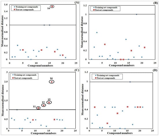 Euclidean distance plots of the developed QSPR model for the AD study. Models were developed with the following dataset splitting methods: (A) Activity sorted; (B) Euclidean distance based; (C) Kennard–Stone based; and (D) K-Medoid clustering.