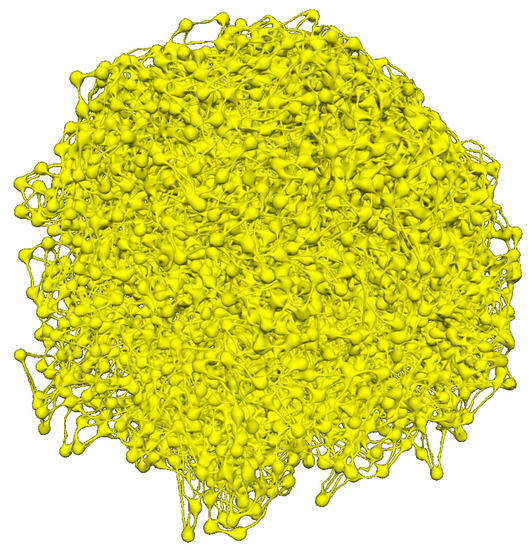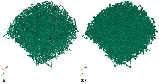 (a) The initialized reticular network as the system of conduits of given topology. State of the simulation at MCS = 0; (b) The reticular network reached its target volume. State of the simulation at MCS = 20.