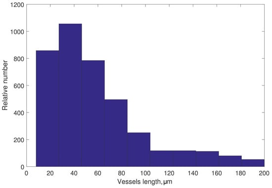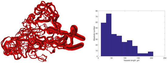 The blood microvascular system is characterized by the length distribution of the vessels as shown in Figure 2 and branch separation from the feeding vessel. The number of capillary vessels was taken from [21] as 40 vessels. It could be approximated as 3 vessels with 5 bifurcations (32 vessels) and 1 vessel with 6 bifurcations (64 vessels), the diameter of input and output vessels was taken as 8 m.