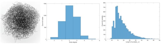 FRC network. (left) Network graph; (center) Node degree distribution; (right) Edges lengths distribution.