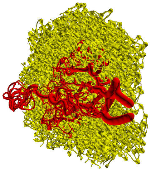 All the algorithms were implemented using C++ language and Microsoft Visual Studio 2015 IDE. Construction of the vascular graph takes about 10 min and 20 Mb of RAM (CPU - Intel Core i7-4700HQ 2.40 GHz), integration of the blood vascular vessels and FRC network takes 20 min, and additional operations (voxel approximation, smoothing of the 3D surface) requires about 2 h CPU time.