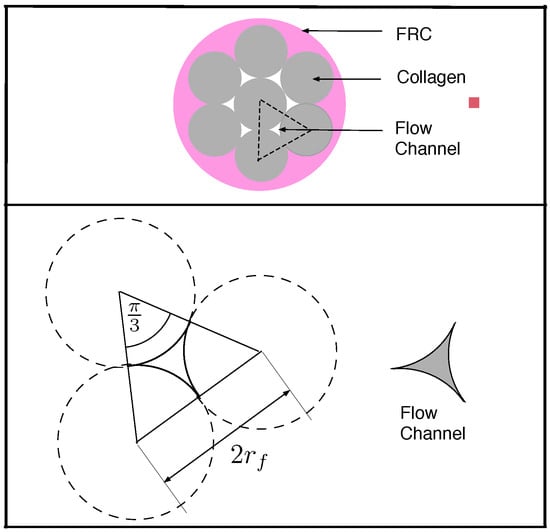 FRC network conduits consist of reticular fibres arranged in bundles encased by FRCs [31]. These conduits have been observed with radii between 200 nm and m [32], consisting of 10–100 reticular fibres [33] with radii of 20–40 nm [34]. Microscopy of FRC conduits appear to show that the fibres are densely packed [33]. Lagrange found the optimal packing of cylinders is hexagonal with a maximum fibre density of . There is some justification for the assumption that FRC conduits consist of reticular fibres arranged in such a manner. As the FRCs hold the fibres together it is likely that they exert a force on the fibres pushing them close to one another. The above numbers would suggest that a 200 nm radius conduit would have between 7 and 29 fibres which would appear to approximately agree with values found in literature [33]. A diagram showing the paths between fibres available for flow and the arrangement of the fibres is shown below in Figure 7.