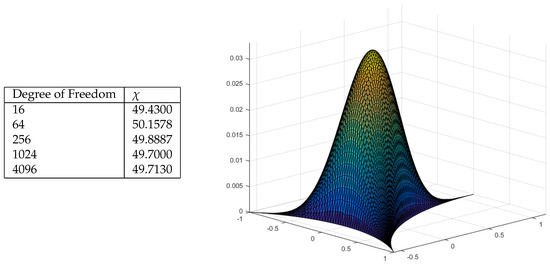 (left) Table of area independent parameter χ against degrees of freedom in the FEA model; (right) Numerically computed velocity profile of flow through a curvilinear triangle with area .