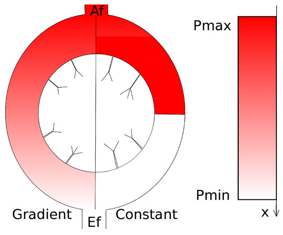 The system (10) needs to be closed by setting boundary conditions. The conduit network is connected to the floor of the subcapsular sinus. In our model implementation, the nodes located at the border of the FRC network graph are connected to the SCS by additional edges. The flow through the system depends on pressures in these vessels. There is no experimental data on the pressure distribution in the SCS. In this study we consider two variants of pressure distribution (see Figure 9). If we set the x-axis in the direction of flow through the LN then boundary vertices with smaller x-coordinate will have higher pressure values. The first variant of pressure distribution is called <<Gradient>> with a linear decline from Pa to Pa depending on x-coordinate. The pressure estimates are based on values reported in [3,4,38]. The second variant is referred by term <<Constant>>. If we set a plane normal to the x-axis dividing the LN into two halves of equal length, points in the upper half will have a value of and points in the lower half will have .