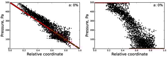 Pressure values depending on coordinate. (left) for gradient boundary conditions; (right) for constant boundary conditions. Boundary points are highlighted in red.