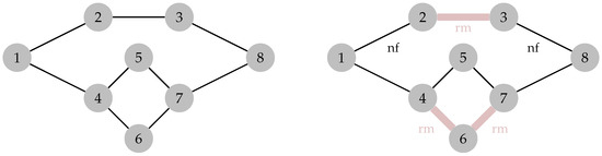 Viral infections suffered by the immune system can destroy parts of the FRC network and lead to its disruption [8,14]. We applied the model of lymph flow in the conduit system to parameterize the destruction process and study its effect on lymphatic system function. To simulate a disrupted conduit system we delete edges from randomly. If all edges connected to a node are deleted it becomes isolated, with zero pressure. Deletion of edges also leads to broken chains and pendant (or leaf) vertices. Mass conservation law implies that there is no flow into pendant vertex and no flow through broken chains. Some edges which are not removed may have no flow and so disfunction, we call these edges non-functional (<<n-f edges>>). For example, in Figure 11 illustrating the disruption elements vertices 2 and 3 are pendant, edges (1–2) and (3–8) are non-functional, vertex 6—isolated.