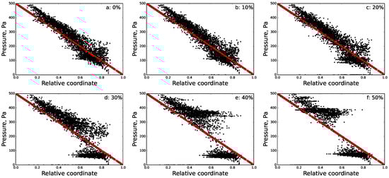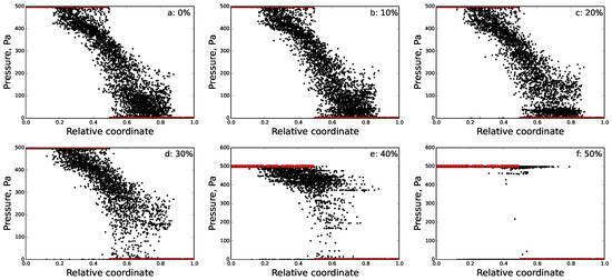 Pressure gradient for (a–f) 0%–50% edges removed (constant boundary conditions). Boundary points are highlighted in red.