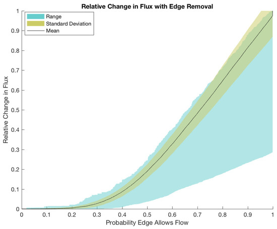As both viscous and diffusive effects have the same dependance on length the relationship shown in Figure 14 is true of both diffusion and fluid flux. The high suggests a high degree of topological robustness within the network implying a large difference in the importance of edges to maintenance of flow. The range indicates the minimum and maximum relative fluxes recorded at a given probability. Note that fluxes far below the standard deviation exist for all , which suggests that some edges are of considerable importance to flow. Verifying the existence of these properties in nature and correctly replicating them in artificial networks will be challenging.