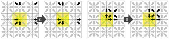It is desired to implement the LBM in such a way that only one array is required while both streaming and collision are combined in a single step, i.e., we are looking for an algorithm that requires only a single array to hold the distributions and reads and writes each datum only once in each time step. Such a technique is called in-place streaming and several methods have been proposed in literature. An early example of an in-place streaming algorithm is the swap algorithm of Mattila et al. [] and Latt []. The swap algorithm combines the streaming and the collision in a single step, but it does not overwrite the input of the local collision by the output. As a result, the swap algorithm requires a certain order in which the lattice nodes have to be processed. This is a severe disadvantage, as it limits the application of the algorithm to serial computations with a clear order of the instructions. The method is not applicable to massively parallel computations.