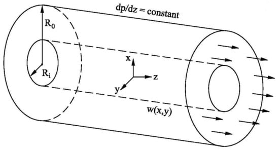 Consider an incompressible Newtonian fluid of density ρ, thermal conductivity λ, and specific heat c contained between two stationary concentric cylinders (i.e., in a concentric annular tube). The inner and outer cylinders have radii of Ri and Ro, respectively. Figure 1 shows a schematic of the annular tube and co-ordinate system.