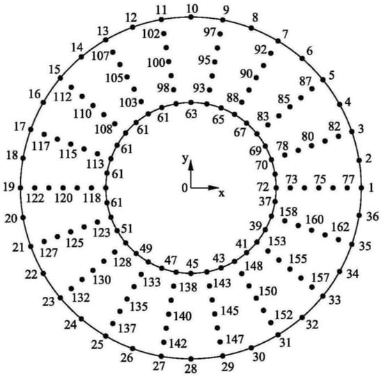 To confirm the accuracy of the DRM for the actual heat convection problem, the boundaries of the external and internal surfaces are discretized into 36, 48, 60, 72, or 84 elements. The nodes on every boundary and at the internal points of the analysis domain are located as shown in Figure 2. Therefore, the total number of internal points used in the analysis is 90, 120, 150, 180, and 210 in the 36, 48, 60, 72, and 84 boundary element cases, respectively.