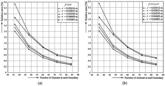 where r is the distance from a source point i, or a DRM collocation point j to a field point (x, y). As for Equation (14), an interpolating function is chosen as a radial basis function (RBF). Two relevant expressions for RBFs are frequently used for this purpose in the engineering community: f = 1 + r and f = 1 + r + r2 [,].
