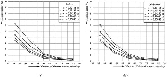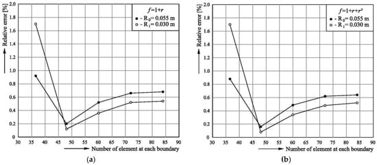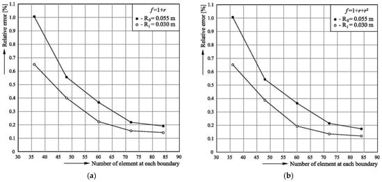 To obtain the axial flow velocity w (x, y), Equation (1) is solved first. The results for the boundary and internal nodes are shown in Table 1 and Table 2 for the RBFs f = 1 + r and f = 1 + r + r2, respectively. In these tables, the normal derivative of the velocity w at the boundary is also listed, and all of the numerical solutions are compared with the exact solutions [], in order to determine their accuracy. In addition, statistical values such as the RMSE, cv, and R2, which correspond to different numbers of boundary elements in the analysed system, are given in Table 1 and Table 2.