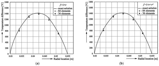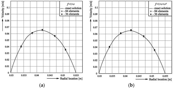 Therefore, the magnitude of the solution’s error in the radial direction is closely related to the physical and the mathematical aspects of the problem; hence, the overall accuracy of the solution is fairly acceptable. Therefore, when 36 elements are used, the solution has a maximum error of 2.34% at radial position r = 0.0342 m, and the next step results in an accurate solution for the temperature. The DRM solutions for the velocity are, in turn, used in the energy equation (Equation (3)) to solve for the temperature distribution. Table 3 and Table 4 show the simulation results for temperature and statistical values such as the RMSE, cv, and R2. The DRM solutions are in excellent agreement with the exact solutions and the relative errors er are within 5% when 36 elements are used (Figure 6, Figure 7 and Figure 8). The cv values are in the range of 0.3%–5.0%, and the R2-value is approximately 0.999 for the two radial basis functions with any of the tested numbers of boundary elements. This is a very acceptable result, and thus, the simulation model is validated by the analytical solutions.