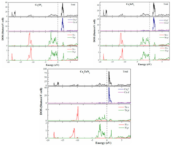Calculated total and partial densities of states (DOS) for Ce2SN2, Ce2SeN2, and Ce2TeN2. The line at zero is the Fermi level.