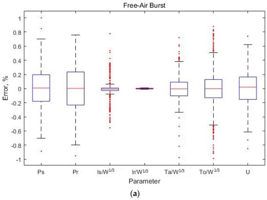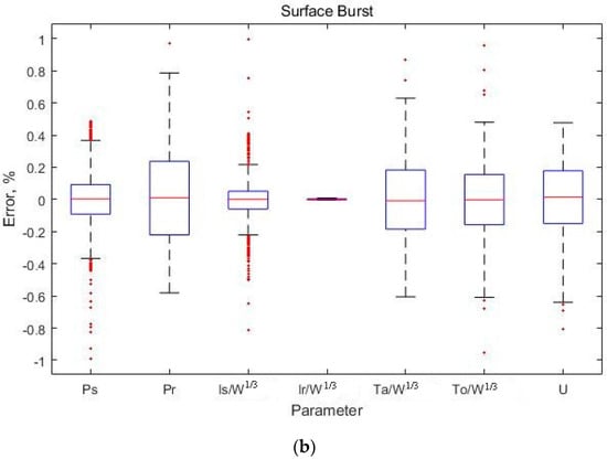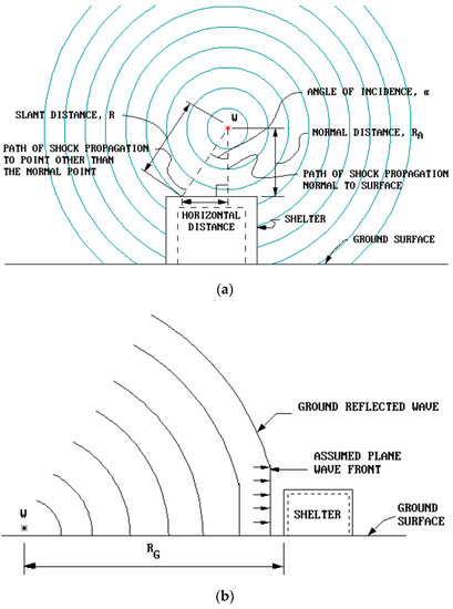 Kingery and Bulmash provided equations for calculating all the parameters together for a free-air burst or a surface burst in addition to the maximum incident blast overpressure, as shown in Equations (2a) and (2b) [