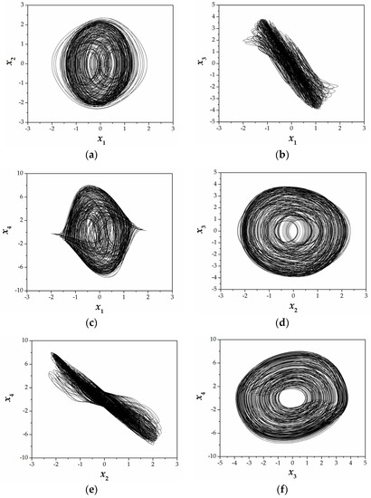 Hyperchaotic attractors of system (8) in (a) x1–x2 plane; (b) x1–x3 plane; (c) x1–x4; (d) x2–x3 plane; (e) x2–x4 plane and (f) x3–x4 plane, for a = 3.8, b = 0.1 and c = 1.5 and initial conditions (x1(0), x2(0), x3(0), x4(0)) = (0.1, 0.1, 0.1, 0.1).