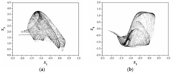 In Figure 1, the hyperchaotic phase portraits of the proposed hyperjerk system (8) are illustrated. In more details, six different phase portraits, which are produced from the combinations of the four variables x1–x4, show the system’s strange attractor for the selected set of parameters and initial conditions. Furthermore, in Figure 2, the Poincaré maps, which are produced by selecting two different planes, display the system (8)’s strange attractor. The study of continuous dynamical systems, like the proposed system (8), through a Poincaré map is one of the most popular topics in nonlinear dynamical analysis. This is done by taking intersections of the system’s orbit into the plane x2 = 0 with dx3/dt > 0. Naturally, for a n dimensional attractor, the Poincaré map gives rise to (n − 1) points, which can describe the dynamics of the attractor properly. Thus, this is an artificial way of reducing the map by dropping its dimension. In this direction, the organized set of points in the Poincaré maps of Figure 2 is an indication of system’s chaotic behavior, while the discrete number of n points is an indication of periodic state of period-n. Finally, a closed curve in the Poincaré map is an indication of the system’s quasiperiodic behavior.