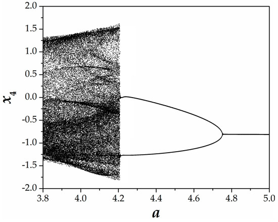 The bifurcation diagram is a very important tool in nonlinear theory, as it provides an overview of the system’s behavior in a range of values of a critical parameter, which is called a bifurcation parameter. These diagrams are produced with repetitive depictions by altering the bifurcation parameter with a small step. Therefore, similar to the Poincaré map, the discrete number of n points in the bifurcation diagram is an indication of periodic state of period-n, while a region with an infinite number of points is an indication of the system’s chaotic behavior. For the production of the bifurcation diagram of Figure 3, we have chosen as the trajectory’s cutting plane the x2 = 0 with dx3/dt > 0, while the parameter a increases with very small step. In addition, the initial conditions at each iteration are (x1(0), x2(0), x3(0), x4(0)) = (0.1, 0.1, 0.1, 0.1).