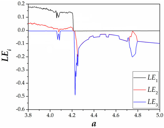 Next, the investigation of the effect of parameter a on system’s dynamics is presented. Due to the fact that the values of parameters b, c do not affect the system’s dynamics but only the size of the attractors, the study of the effect of the parameters b, c has been ignored in this work. The bifurcation diagram and the spectrum of the system’s three largest Lyapunov exponents, by varying the value of the bifurcation parameter a in the range from 3.8 to 5, are presented in Figure 3 and Figure 4, respectively.