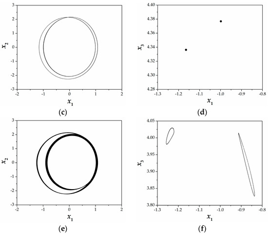 A route to chaos through a quasiperiodic behavior, when decreasing the value of a, is observed in the bifurcation diagram of Figure 3. In more detail, the proposed system (8) displays periodic behavior for a ≥ 4.21, (period-1 steady state and period-2 steady state), which is confirmed from the phase portraits of Figure 5a,c and Poincaré maps of Figure 5b,d, respectively. Especially in the Poincaré maps, which are produced with the same technique as described for the production of the bifurcation diagram, a discrete number of points showing the period of system (8) are depicted. As the parameter a further decreases, the system through a quasiperiodic behavior, which appears in a very narrow band (4.207 ≤ a < 4.210), is driven to a complex behavior for a < 4.207 (Figure 5e). System (8)’s quasiperiodic behavior is confirmed from the closed curves in the Poincaré map of Figure 5f, according to the theory. In addition, the system’s complex behavior for a < 4.207 is mainly hyperchaotic, except for a narrow band in which the system’s behavior is chaotic. The diagram of the spectrum of the three largest Lyapunov exponents of Figure 4 confirms the system’s hyperchaotic behavior due to the fact that, in the aforementioned region (a < 4.207), the system has two positive Lyapunov exponents.