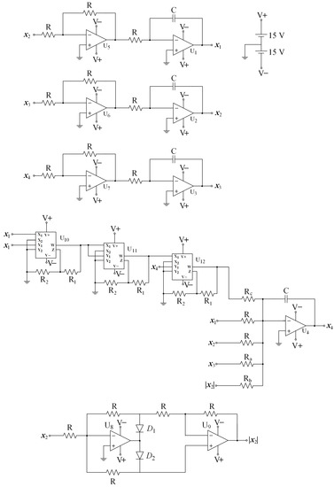 Therefore, in this section, the circuit implementation of the proposed hyperjerk system (8) is presented. In more detail, Figure 6 depicts the circuit that has been designed by using twenty-five resistors, four capacitors, nine operational amplifiers and three analog multipliers (AD633). Four of the operational amplifiers (U1–U4) are configured as Resistor-Capacitor integrators, which is an important operation required in the derivation of the equivalent electronic circuit. The specific realization of the RC integrators, which are very well known in literature, exploits the properties of the operational amplifiers in the linear region, producing in general a current , where VC is the voltage accross the capacitor. Other three operational amplifiers have been used as inverting amplifiers (U5–U7), which use negative feedback to amplify the input voltage. The last ones (U8, U9) with the two diodes (1N4007) are used for implementing the absolute nonlinearity (). The selected configuration for the absolute nonlinearity gives the best results according to literature. Furthermore, the three multipliers (U10–U12) are used for implementing the quintic term c . The low-cost analog multipliers AD633, which are used for this purpose, is the most common approach for realizing polynomial terms or products, like the quintic term cx4x1.