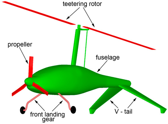 All studies presented in this paper have been conducted for the gyroplane presented in Figure 1. The gyroplane is equipped with a teetering main rotor, three-bladed tractor-type propeller, front landing gear, and inverted V-tail that also serves as a rear landing gear. Like most gyroplanes, the main rotor of the presented gyroplane is a simple design. It is a two-bladed, teetering rotor. Its blades have a rectangular planform, uniform spanwise distribution of airfoil, and are not twisted. To enhance the controllability of the gyroplane, its rotor-head design enables control of the collective pitch of rotor blades.