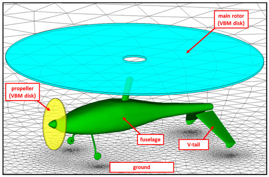 The computational mesh was generated and validated using the ANSYS GAMBIT—a commonly used mesh generator included in earlier distributions of ANSYS CFD software packages. During the rotorcraft flight simulations, the mesh was deformed due to: tilting of the main rotor, changeable distance between the aircraft and the ground, and (optional) deflections of control surfaces. This last type of mesh deformation was not conducted in the flight simulations discussed in this paper. The quality of the mesh deformed during the simulations was controlled by both the internal procedures of the ANSYS FLUENT and the dedicated procedures included within the developed in-house UDF module KINEMATICS.