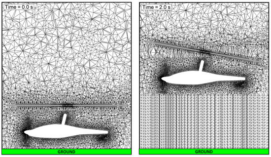 Cross-section of computational mesh around the gyroplane in two different stages of flight Left: a ground pre-rotation, right: a forward flight a few meters above the ground.