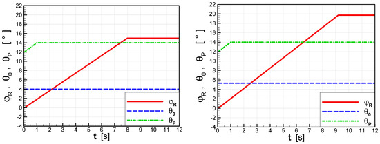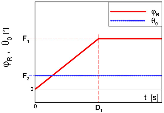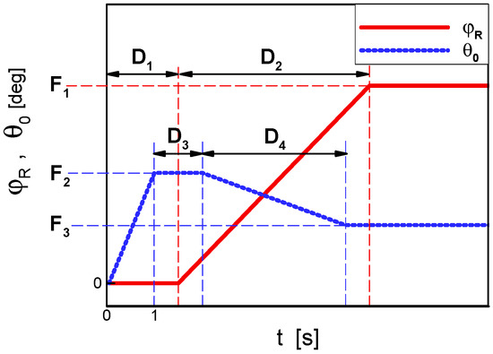 Improvement of gyroplane flight control strategy during the jump takeoff was conducted based on the numerical optimization approach described in Section 2. In this case, the optimization was conducted with respect to the time-varying pitch angle of the main rotor (ϕR) and the angle of collective pitch of the rotor blades (θ0). Based on these assumptions, the time-varying flight control parameters ϕR(t) and θ0(t) were assumed to have the form defined by Equation (1) as piecewise linear functions ΨM(t). Parameters M, {ti}i=0,1,…,M and {fi}i=0,1,…,M of these functions were related with the presented in Figure 14 design parameters D1, D2, D3, D4, F1, F2 and F3 according to the following dependencies: