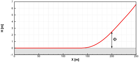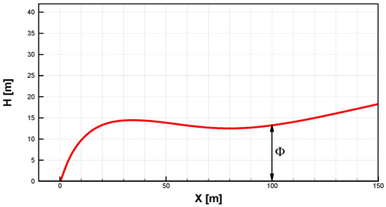 Based on the opinions of gyroplane designers and pilots, such a relatively simple parameterization should sufficiently approximate the real flight control procedures utilized during the takeoff and ascent of gyroplane. This especially concerns the presented study, which is more about demonstration than implementation. In the discussed case, the optimization aimed at maximization of the altitude (H) reached by the gyroplane after traveling the distance X = 200 m from the initial position, which is explained in Figure 6. The optimization problem was formulated mathematically as a search for the set of the design parameters D1, F1 and F2 maximizing the following objective function Φ: