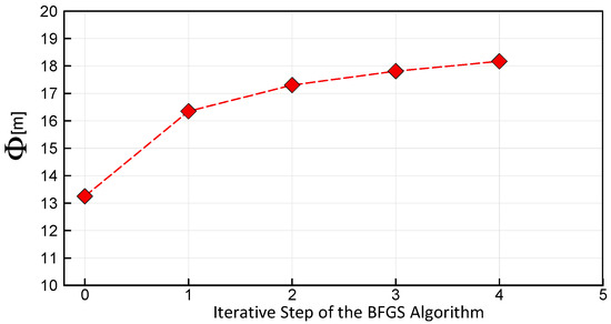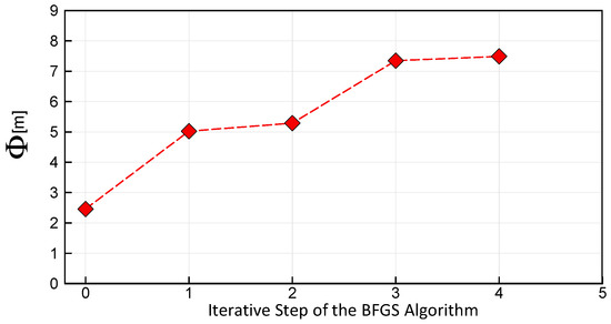 The optimization problem has been solved iteratively using the BFGS algorithm, discussed in Section 2. In the sequential steps of the optimization process, this procedure has been improved from the point of view of maximizing the objective function Φ in Equation (4). In each iterative step, the partial derivatives of the objective function Φ with respect to the unknown design parameters had to be approximated due to the requirements of the BFGS Algorithm. These derivatives were evaluated by means of the one-sided finite-difference approximation. This required performing at least N + 1 simulations of the classic takeoff of the gyroplane, where N = 3 was the number of independent variables in Equation (4). In addition, solving the auxiliary one-dimensional problem of finding the optimal movement in the newfound search direction, eight additional classic gyroplane takeoff simulations were conducted in each optimization step.
