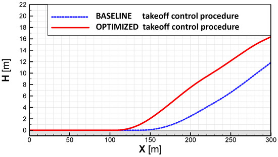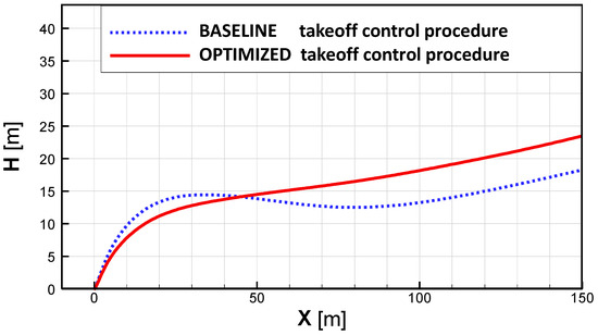 Aircraft trajectories obtained for the baseline and optimized procedures of flight control during the classic takeoff of the gyroplane.