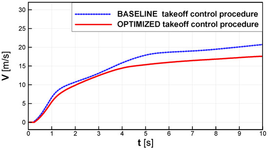 Aircraft flight velocity (V) vs. time (t) during the jump takeoff, for the baseline and optimized procedures of gyroplane flight control.