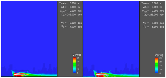 Comparison of velocity magnitude contours around the gyroplane during the classic takeoff, for two configurations related to baseline (left) and optimized (right) flight control procedures. The initial time (t = 0 s) of the aircraft run on a runway.