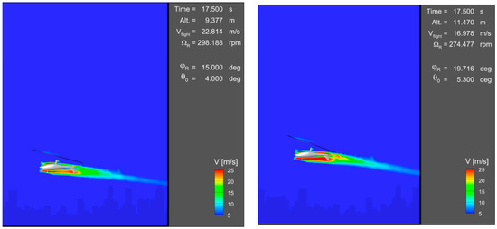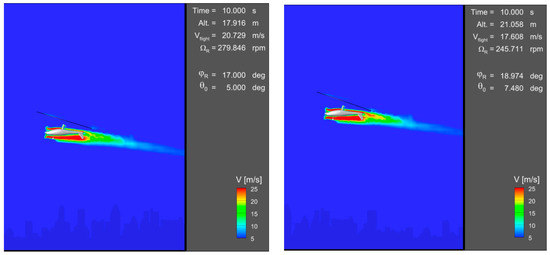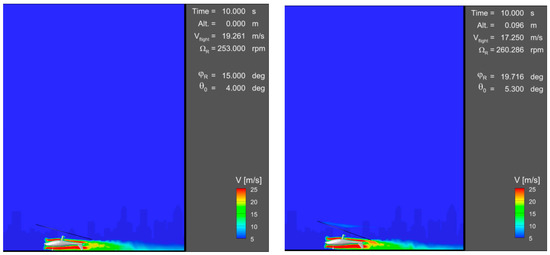 Comparison of velocity magnitude contours around the gyroplane during the jump takeoff, for two configurations related to baseline (left) and optimized (right) flight control procedures. Time elapsed from the beginning of the jump takeoff: t = 10 s.