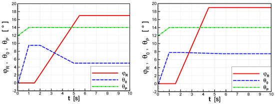 Comparison of the baseline (left) and optimized (right) classic takeoff control procedures, showing the pitch angle of main rotor (ϕR), collective pitch of rotor blades (θ0) and collective pitch of propeller blades (θP) as functions of time (t).