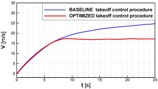 Aircraft flight velocity (V) vs. time (t) during the classic takeoff, for the baseline and optimized procedures of gyroplane flight control.